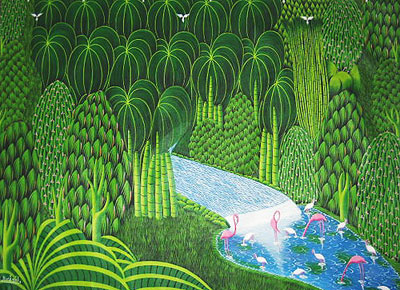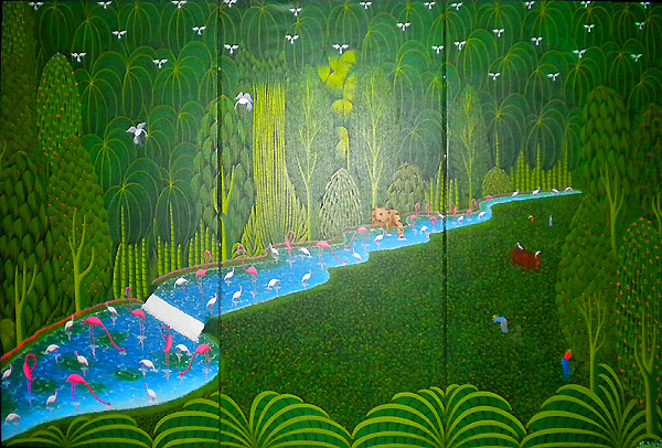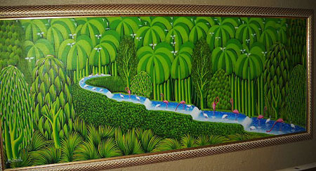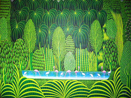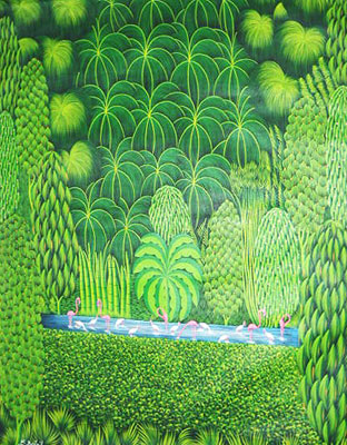 Born in Gonaives on September 19,1952, Bresil moved to Port-Au-Prince in 1973. Very talented, he impressed his peers with his techniques. He won the Ispan-Unesco prize in 1981. Collectors seem to love his "Green Jungles" and art lovers can merely get enough of his "Flamingoes". Bresil has had many exhibitions in Haiti, Japan, the US, Italy, Puerto Rico, Switzerland etc. Many newspapers and magazines have praised his work including Hostess Magazine, the New York Times and the Miami Herald. He was killed in 1999 |